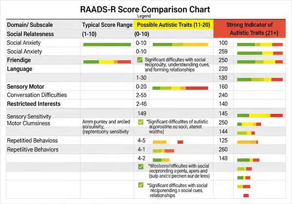 For a comprehensive breakdown of these traits, you can view the RAADS-R test domains directly on the assessment page to see which questions fall into which category.